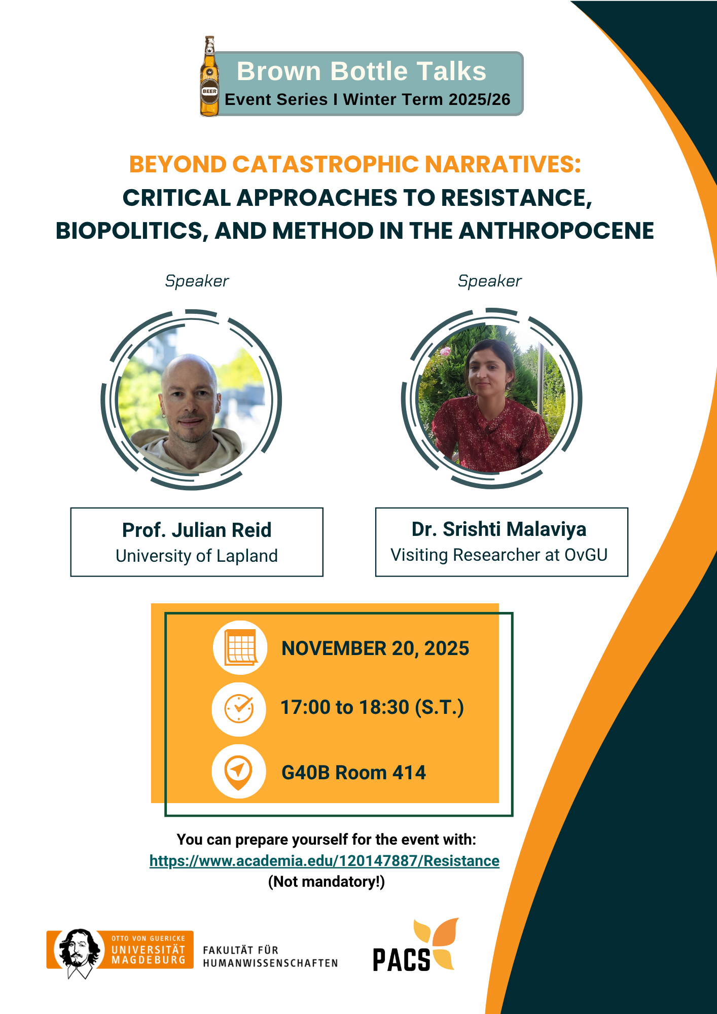 With the topic "Rethinking Resistance in the Anthropocene: Catastrophic Biopolitics and Nomadic Methodologies", the second round of talks will be held by Prof. Julian Reid (University of Lapland) and Dr. Srishti Malaviya (Visiting Researcher at OvGU).